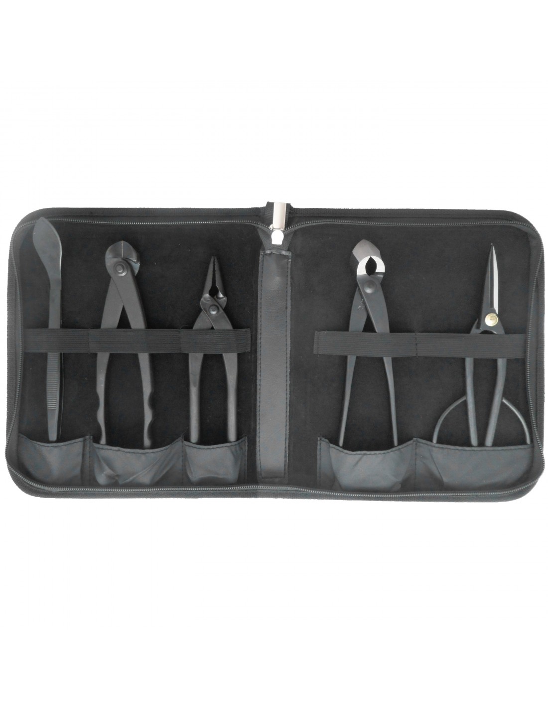 Inhalt: Schere 200 mm/140 g, Pinzette mit Spatel 215mm/40 g, Drahtzange 200mm/210 g, Konkavezange 205 mm/190 g, Zange 180 mm/170 g