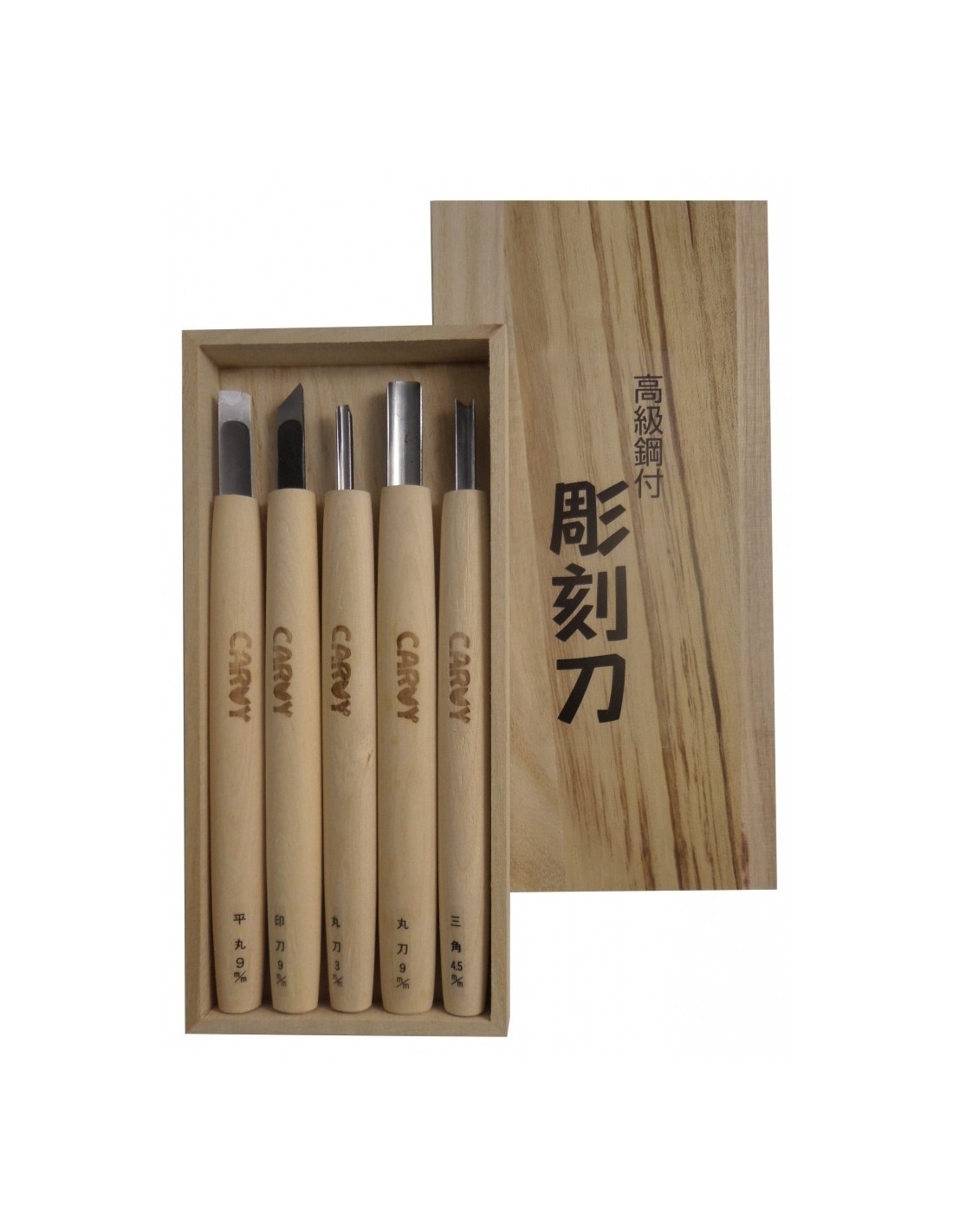 Leichte und händliche Schnitzmesser für Holzschnitte Satz mit Schrägeisen und Flacheisen 9 mm; Hohleisen 3 und 9 mm; V-Eisen 4,5 mm. Hergestellt in Japan mit "Blue Paper 2" Kohlenstoffstahl.