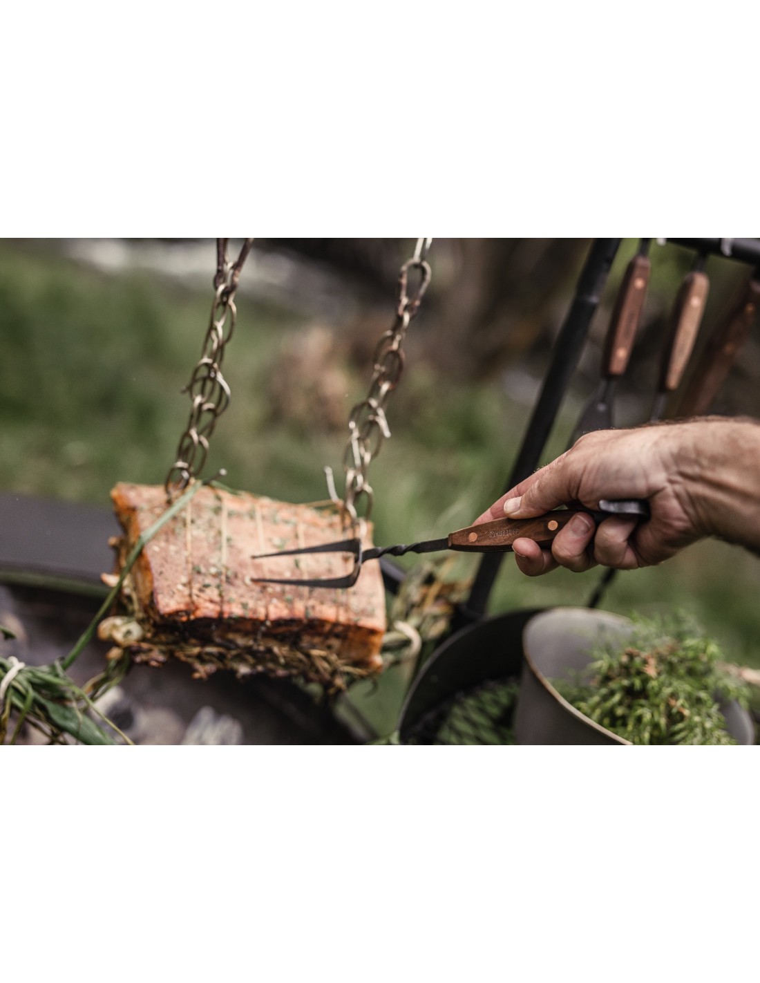 Halten Sie Lebensmittel sicher an Ort und Stelle für diesen makellosen Schnitt oder Schnitzer. Die Barebones Living Carving Fork ist aus handgeschmiedetem Edelstahl gefertigt und mit einem glatten, natürlichen Nussbaumgriff ausgestattet, der bei großer Hitze kühl bleibt. Entwickelt für Komfort und Sicherheit bei der Arbeit rund um Feuer und heiße Kohlen.