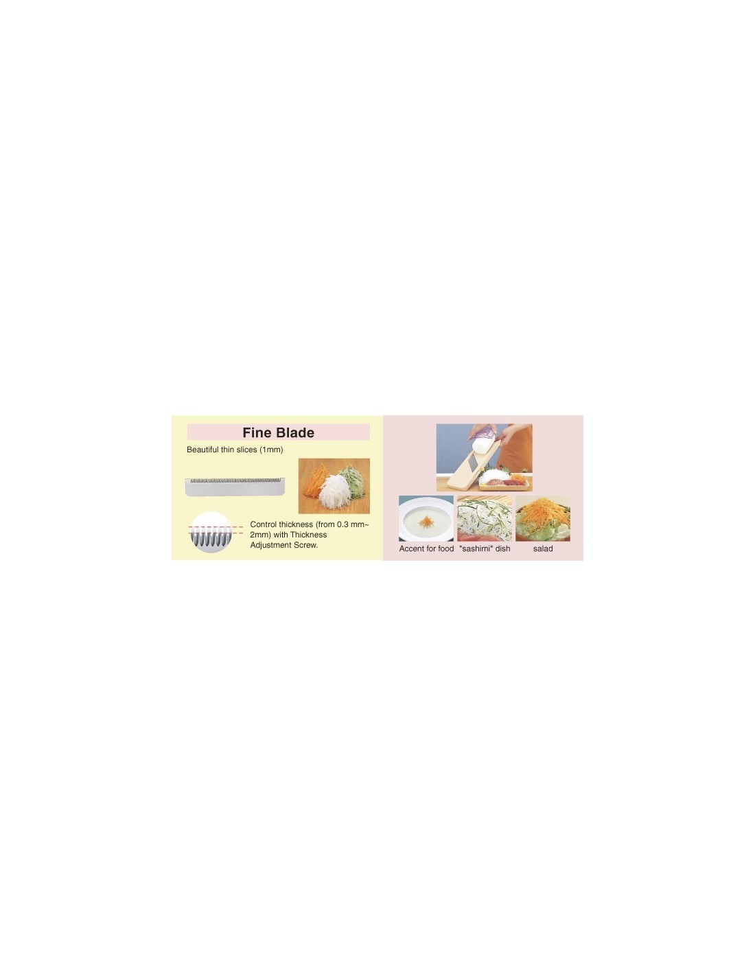 - Supplied with one plain edge blade and three blades to be placed vertically to cut julienne strips: Fine - Medium - Coarse (width ~ 1 - 2.5 - 4 mm)