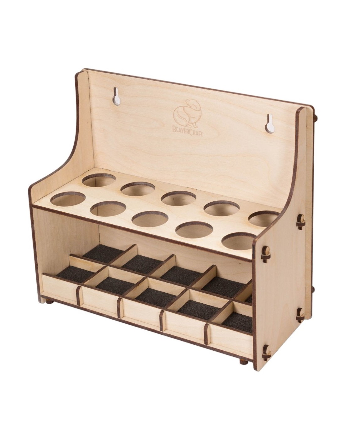Porte-outils en contreplaqué pour garde vos couteaux soigneusement dans un espace compact. Base recouverte en mousse polymère pour protèger les lames des outils.