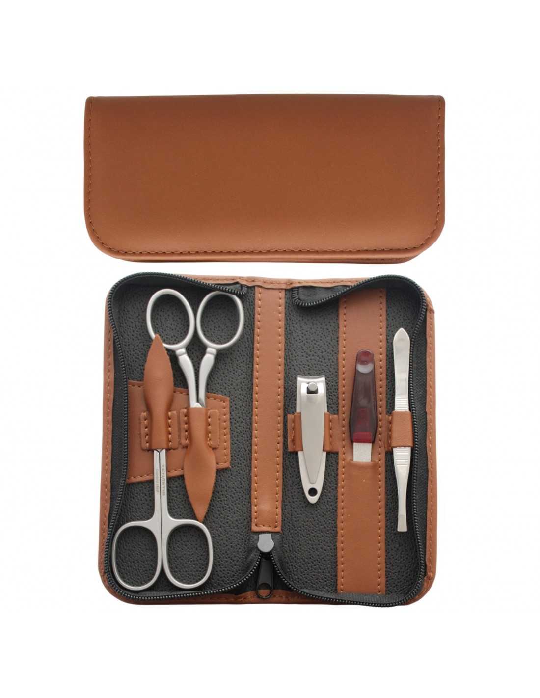 Set Manucure 5 pièces Inox en Cuir avec Coupe Ongles et Fermeture à Glissière Marron - Tenartis Fabriqué en Italie