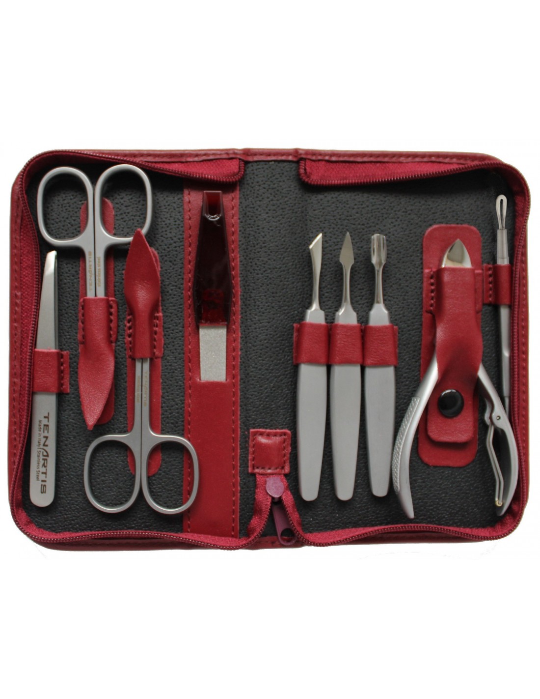 Set Manicure e Pedicure Professionale 9 Pezzi Inox in Vera Pelle con Cerniera Bordeaux - Tenartis Made in Italy